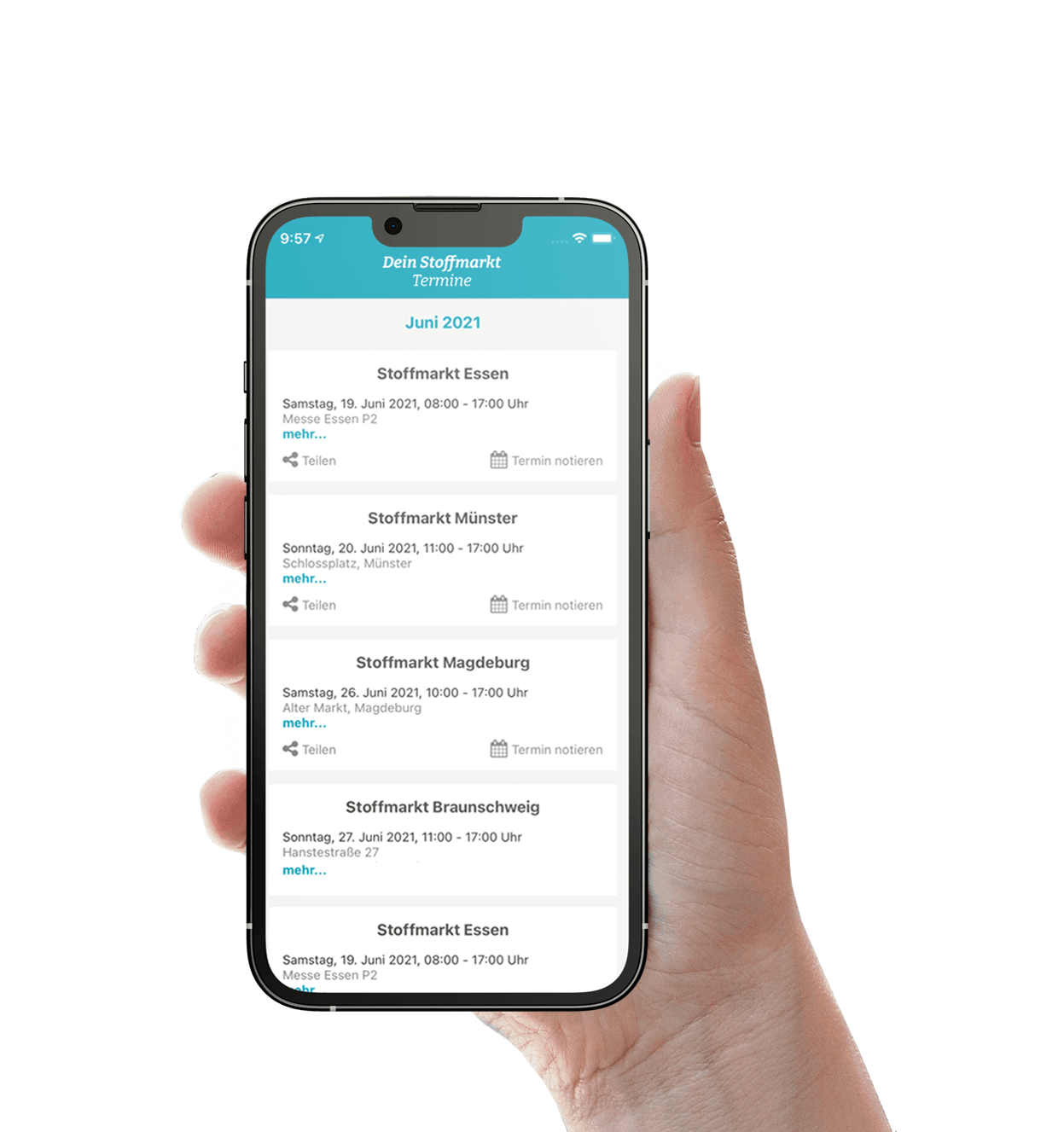 Exportiere Termine direkt in Deinen Kalender und verpasse keinen Stoffmarkt. Erhalte alle wichtigen Infos per Push-Nachricht – von Öffnungszeiten über Regeln bis zu kurzfristigen Absagen – und bleibe immer auf dem neuesten Stand.