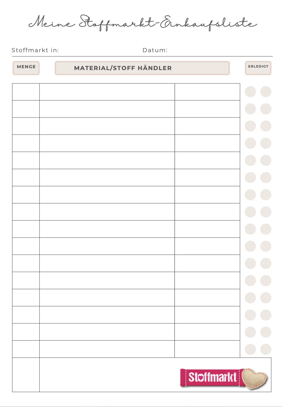 Eine übersichtliche Checkliste für deine nächsten Stoffkäufe. Mit Spalten für Material, Menge, Händler und Datum – plus Notizraum für spontane Ideen. Mach deine Einkäufe stressfrei und organisiert!